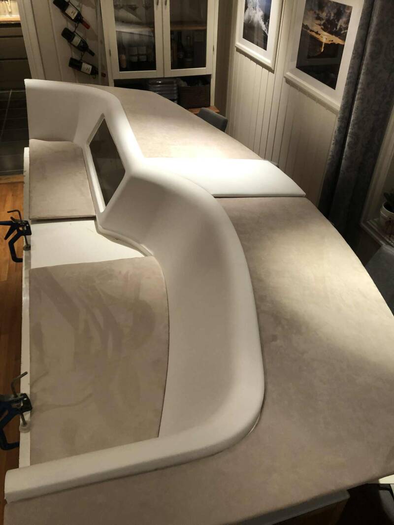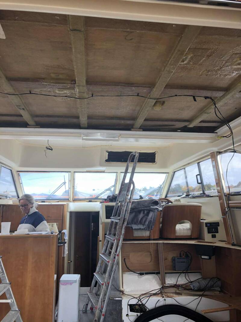 Vi har revet vegger og tak i nesten hele båten. Der har vi lagt på ny skai eller imitert semsket. Vi har sydd nytt trekk til begge sofaene, og byttet skum i sitteputene. Madrassen i forpiggen er også skiftet.